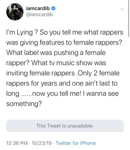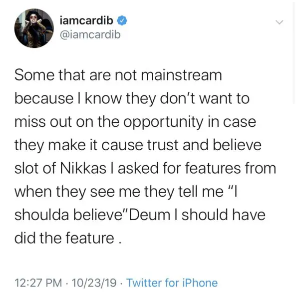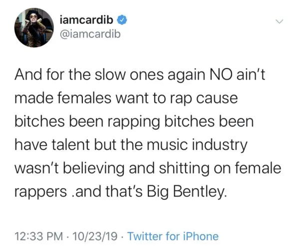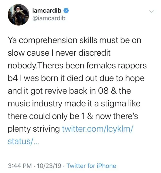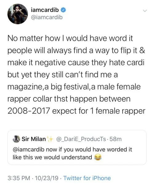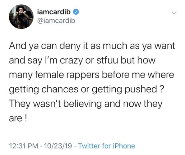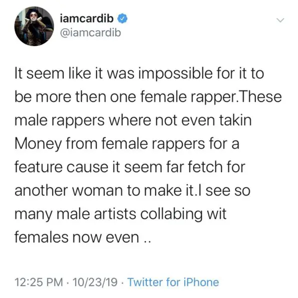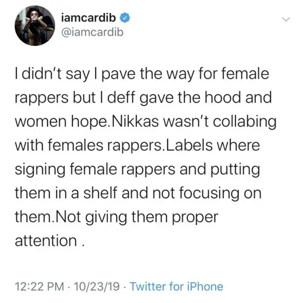 In her latest Twitter rant, Cardi acknowledges that she wasn’t the first woman to take hip-hop by storm, but says she should receive her just due for making it cool for male rappers to collaborate with femcees. She said: