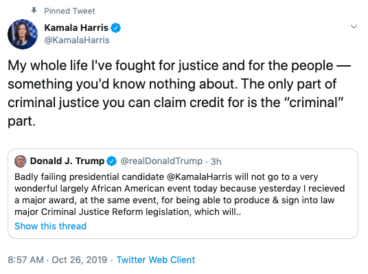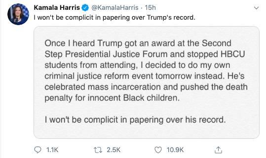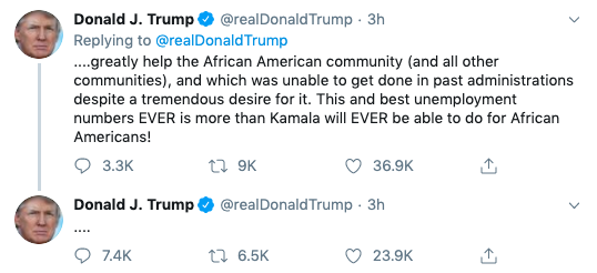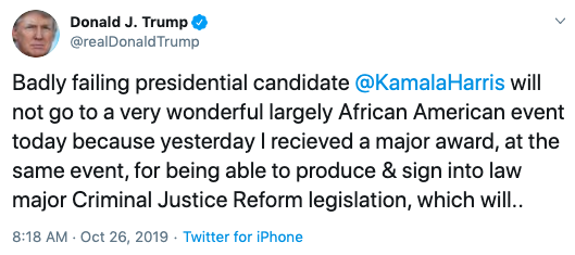 “Badly failing presidential candidate @kamalaharris will not go to a very wonderful largely African American event today because yesterday I recieved a major award, at the same event, for being able to produce & sign into law major Criminal Justice Reform legislation, which will greatly help the African American community (and all other communities), and which was unable to get done in past administrations despite a tremendous desire for it. This and best unemployment numbers EVER is more than Kamala will EVER be able to do for African Americans!”