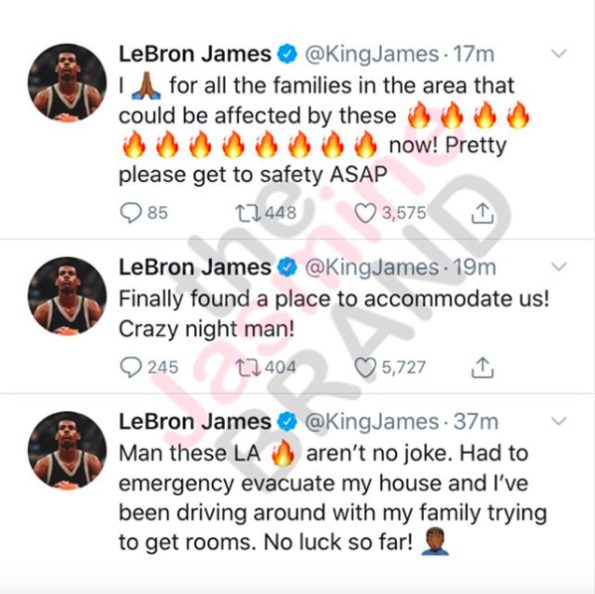 “Man these LA [fires] are no joke. Had to emergency evacuate my house and I’ve been driving around with my family trying to get rooms. No luck so far!”