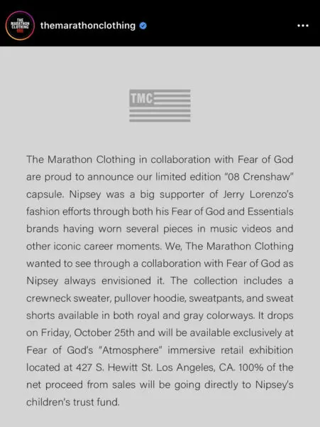 “Nipsey was a big supporter of Jerry Lorenzo’s fashion efforts through both his Fear of God and Essentials brands, having worn several pieces in music videos and other iconic career moments. We, The Marathon Clothing, wanted to see through a collaboration with Fear of God as Nipsey always envisioned it.”