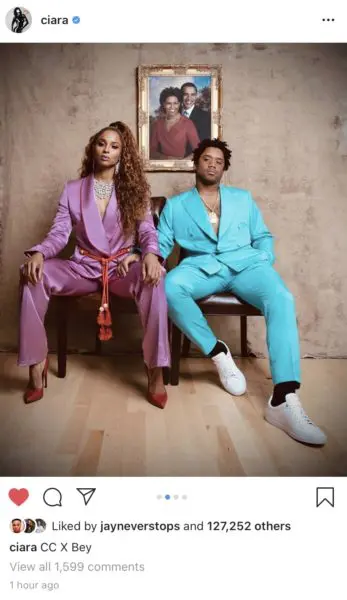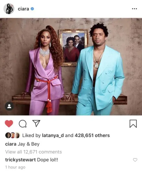 But Ciara and her superstar quarterback husband, Russell Wilson, broke the internet with their recreation of Jay-Z and Beyonce‘s “Apesh*t” music video look. But, instead of the world famous Mona Lisa painting, the Wilsons included a portrait of Barack and Michelle Obama.