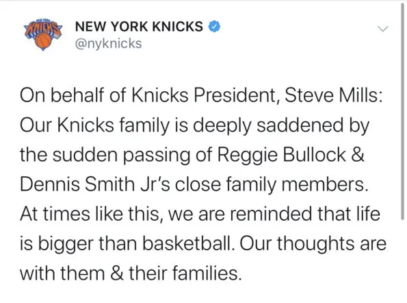 “Our Knicks family is deeply saddened by the sudden passing of two of our players’ close family members. At times like this, we are reminded that life is bigger than basketball. Our thoughts are with them and their families.”