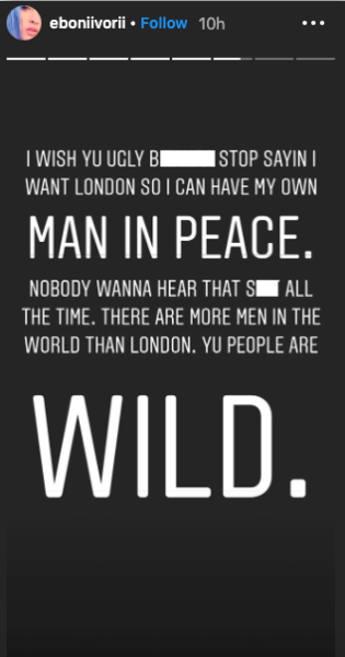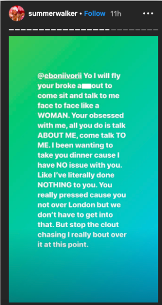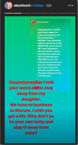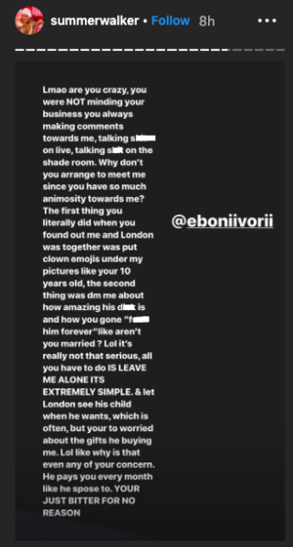 Eboni then said she was simply minding her business, and warned Summer to stay away from the child before she gets a restraining order. Summer then said Eboni is “miserable” as she detailed Eboni hopping in her DMs after it was revealed she was dating London.