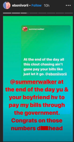 Summer then said Eboni was just trying to get attention. While Summer told Eboni that “clout chasing” won’t pay her bills, Eboni clapped back and said Summer and London pay them, thanks to the government.