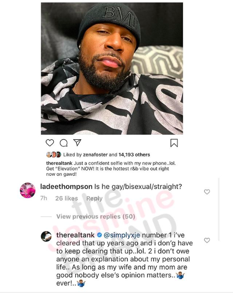 It looks like Tank is over questions about his sexuality. He responded to a social media user who blatantly questioned him about it on Instagram. He responded:
