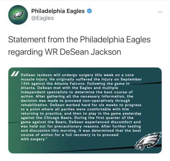 DeSean Jackson unfortunately reinjured his abdomen in the Eagles’s Sunday (Nov. 3rd), night 22-14 win against the Chicago Bears. He originally declined surgery after suffering a reported Grade 2 abdominal strain Week 2 against the Falcons and returned Sunday after missing six games.