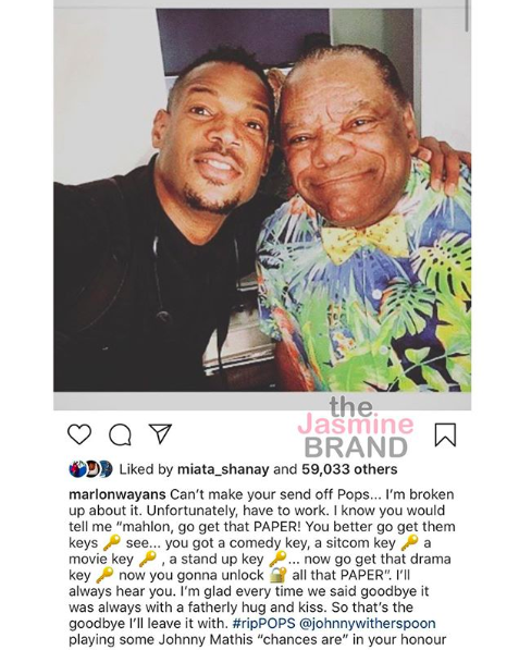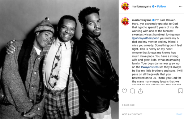Marlon Wayans, who played John Witherspoon’s son on the hit series The Wayans Brothers, also mourned Witherspoon when his passing was announced last month.