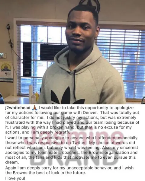 “I want to personally apologize to anyone who I offended, especially those who I was responsive to on Twitter. My choice of words did not reflect who I am, but only what I was feeling. Also, my sincerest apologies to my teammates, coaches, the Browns organization and most of all, the fans and kids that motivate me to even pursue this dream.”