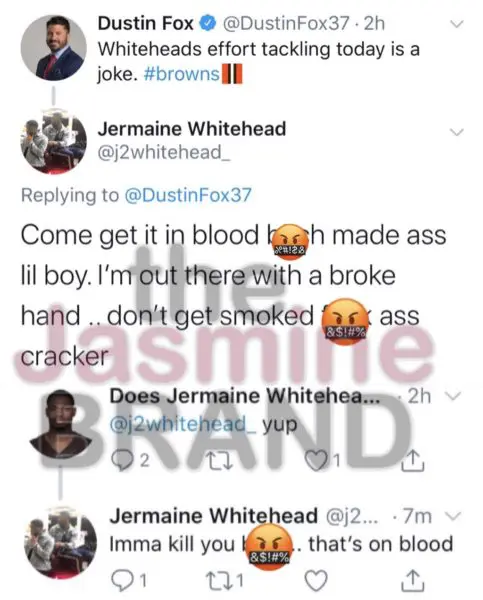 After a heated social media exchange over the weekend (Nov. 3rd), former Cleveland Browns safety, Jermaine Whitehead is now out of a job as he was cut by the franchise for his online threats. Shortly after the Browns 24-19 loss to the Denver Broncos on Sunday, Jermaine Whitehead, 26, lashed out on Twitter with a series of aggressive messages in response to criticism. In one of his alarming tweets, not only did he threaten to fight a reporter, Jermaine Whitehead called the reporter a racial slur. He writes,