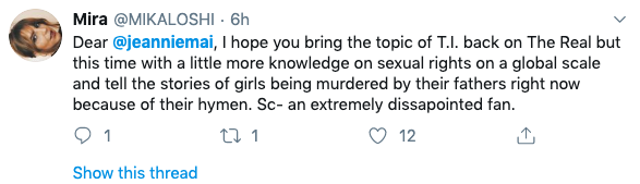 While fans went off on T.I. after he admitted he takes his daughter to her annual OB-GYN appointments to make sure she’s still a virgin, Jeannie Mai of daytime talk show The Real agreed with him.