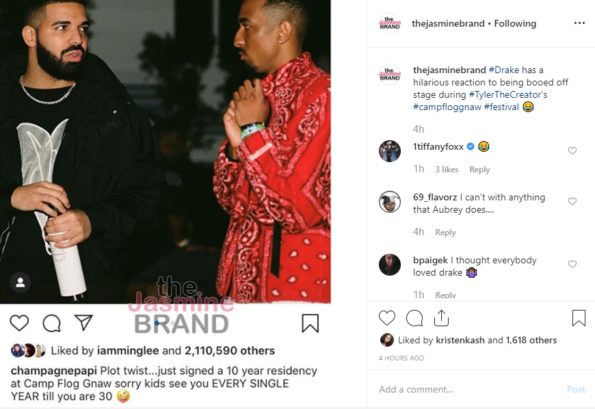He said it best: rapper Drake can’t take a joke, ’cause it’s not one! He was recently the surprise special guest at Odd Future rapper Tyler the Creator‘s coveted music festival, Camp Flog Gnaw, this weekend. However, fans were less than elated to see the “In My Feelings” rapper. After realizing that singer Frank Ocean was not the surprise guest, they booed Drake offstage!