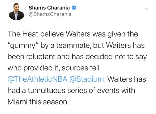 “The Heat believe Waiters was given the “gummy” by a teammate, but Waiters has been reluctant and has decided not to say who provided it.”