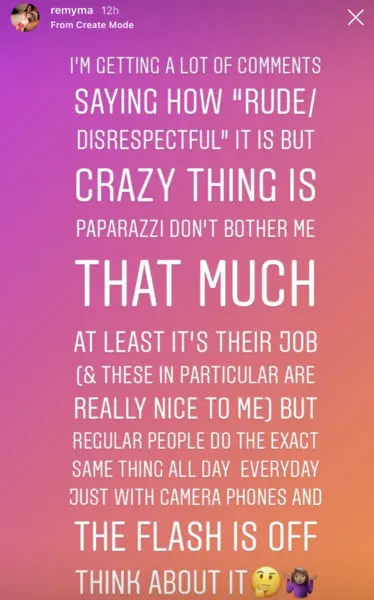 The fan apologized and stopped filming, but Remy used that moment as the opportunity to send a message and share her side of what happened. She wrote in a post she has since deleted,
