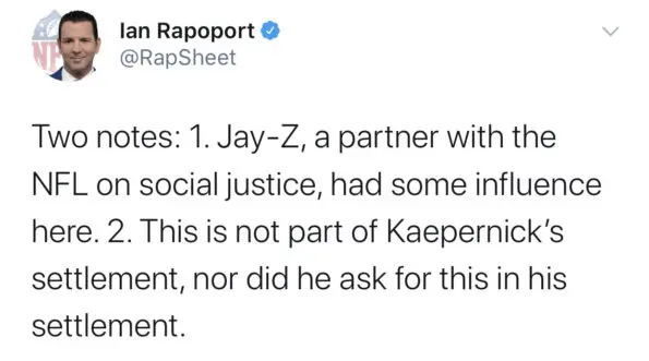 “I am also told that JAY-Z—who has been working with the NFL on some social justice initiatives—was involved in this and pushed this idea to some extent.”