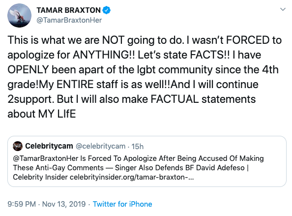 “This is what we are NOT going to do. I wasn’t FORCED to apologize for ANYTHING!! Let’s state FACTS!! I have OPENLY been apart of the lgbt community since the 4th grade!My ENTIRE staff is as well!!And I will continue 2support. But I will also make FACTUAL statements about MY LIfE”