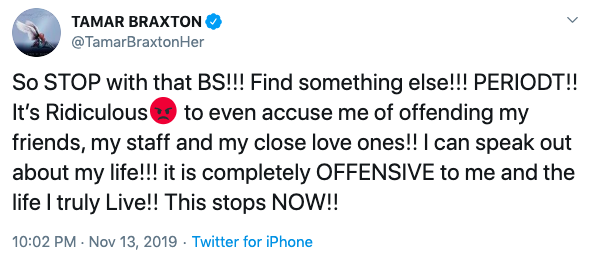 “So STOP with that BS!!! Find something else!!! PERIODT!! It’s Ridiculous to even accuse me of offending my friends, my staff and my close love ones!! I can speak out about my life!!! it is completely OFFENSIVE to me and the life I truly Live!! This stops NOW!!”