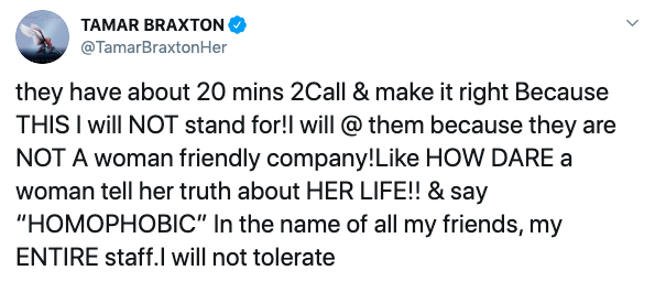 “they have about 20 mins 2Call & make it right Because THIS I will NOT stand for!I will @ them because they are NOT A woman friendly company!Like HOW DARE a woman tell her truth about HER LIFE!! & say “HOMOPHOBIC” In the name of all my friends, my ENTIRE staff.I will not tolerate”