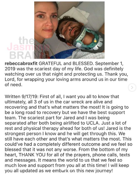 She also shared a message she wrote just a couple of weeks after the accident, and revealed that she and her future husband were separated after being rushed to the hospital via air. Fortunately, as of Thursday (Nov. 14), she said they were feeling so much better.