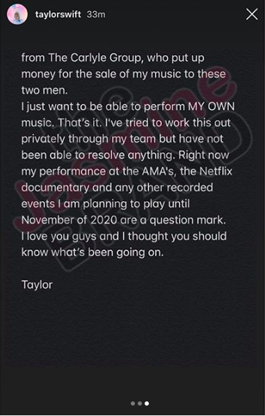 “Guys – it’s been announced recently that the American Music Awards will be honoring me with the Artist of the Decade Award at this year’s ceremony. I’ve been planning to perform a medley of my hits throughout the decade on the show. scott Borchetta and Scooter Braun have now said that I’m not allowed to perform my old songs on television because they claim that would be re-recording my music before I’m allowed to next year.”