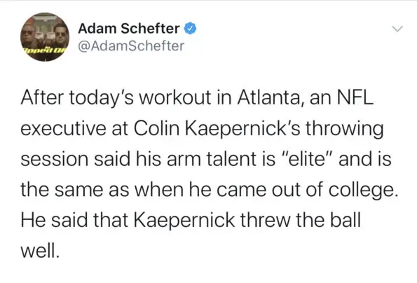 “After today’s workout in Atlanta, an NFL executive at Colin Kaepernick’s throwing session said his arm talent is “elite” and is the same as when he came out of college. He said that Kaepernick threw the ball well.”