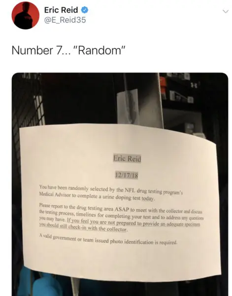 “You have been randomly selected by the NFL drug testing program’s Medical Advisor to completed a urine doping test today.”