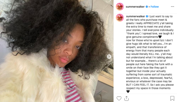 Summer Walker has been real about her battle with anxiety and mental health issues. Days before her most recent post, she explained why she doesn’t want to get too close to fans at meet-and-greets.