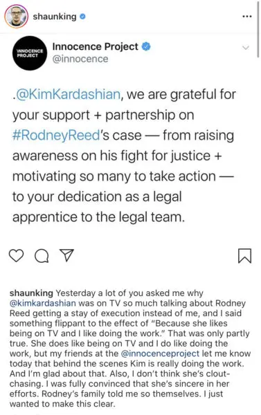 “Yesterday a lot of you asked me why @kimkardashian was on TV so much talking about Rodney Reed getting a stay of execution instead of me, and I said something flippant to the effect of “Because she likes being on TV and I like doing the work.” That was only partly true. She does like being on TV and I do like doing the work, but my friends at the @innocenceproject let me know today that behind the scenes Kim is really doing the work. And I’m glad about that. Also, I don’t think she’s clout-chasing. I was fully convinced that she’s sincere in her efforts. Rodney’s family told me so themselves. I just wanted to make this clear.”