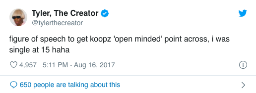 Tyler, The Creator previously spoke on his sexuality in the song “I Ain’t Got Time” from the album Scum F*** Flower Boy that was released in 2017.