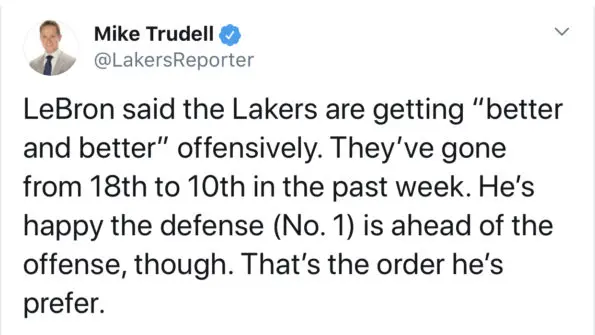 The 34-year-old had improved his defensive rating of 107.6 from last year. The Lakers as a whole are tied for the fewest points allowed per game. LeBron spoke to reporters after the home victory touching on the Lakers efforts on defense.