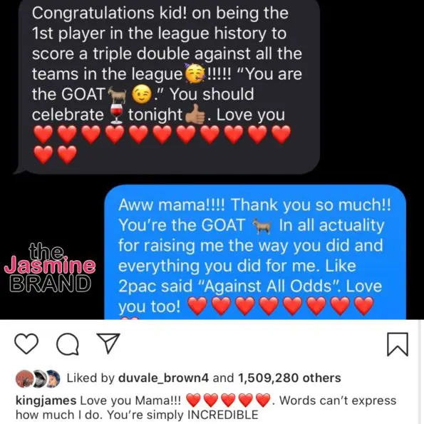 In response to his new career highlight, LeBron’s mother, Gloria James texted her son a loving and cute text to congratulate the NBA superstar. She writes,