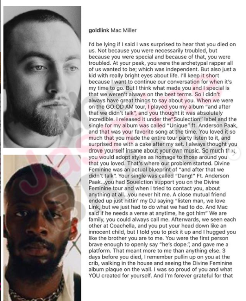 Still, despite their differences, Goldlink said he was proud of Mac Miller, and revealed he saw him just days before his untimely passing at Mac Miller’s home, where he spotted the plaque for Mac Miller’s Divine Feminine album. See his full post below.