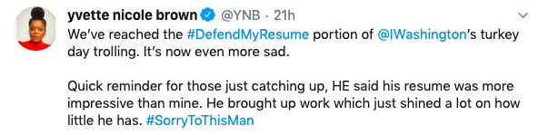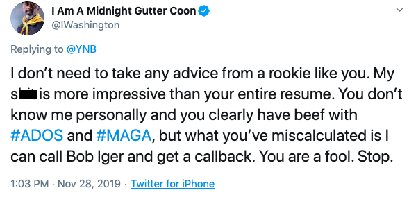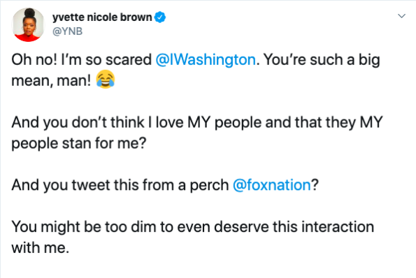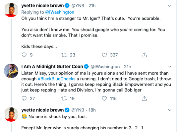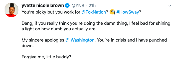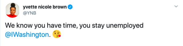 “Be careful chasing clout and dirty dollars @IWashington That has historically not worked out well for you. As for me, I sleep well at night and stay working in my CHOSEN field. How ‘bout you, boo? When you quote me on your little show quote it ALL & spell my name right.”