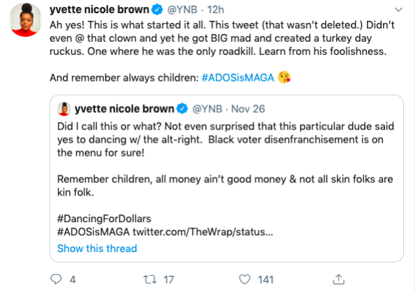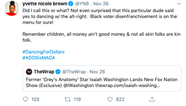 “Did I call this or what? Not even surprised that this particular dude said yes to dancing w/ the alt-right. Black voter disenfranchisement is on the menu for sure! Remember children, all money ain’t good money & not all skin folks are kin folk.”