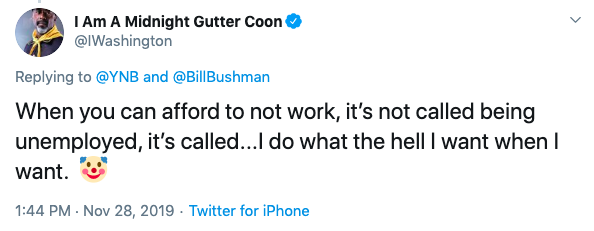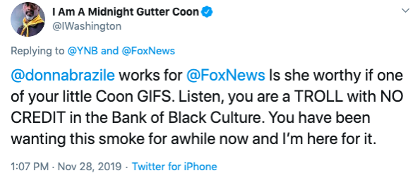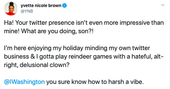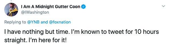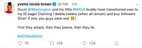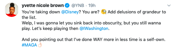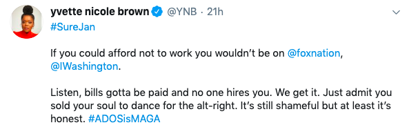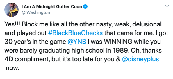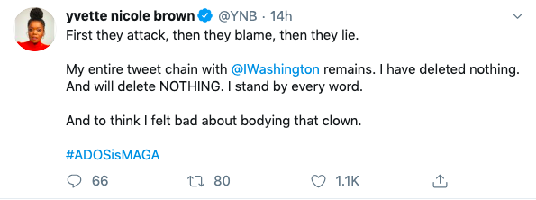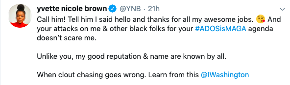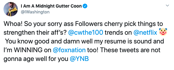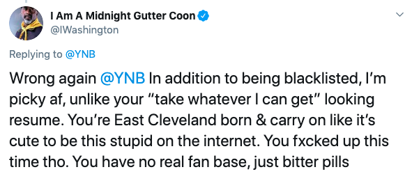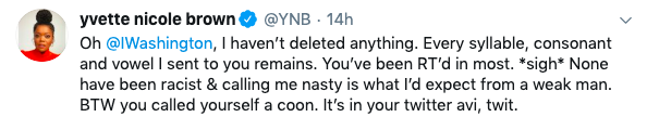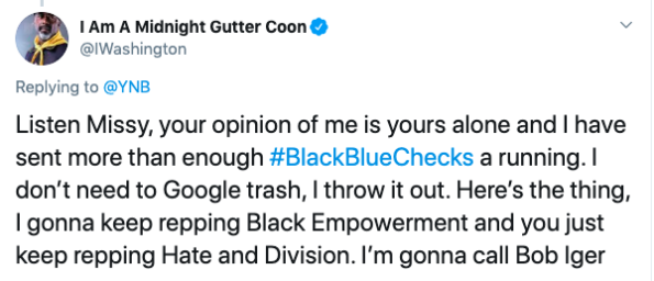 “Be careful chasing clout and dirty dollars @IWashington That has historically not worked out well for you. As for me, I sleep well at night and stay working in my CHOSEN field. How ‘bout you, boo? When you quote me on your little show quote it ALL & spell my name right.”