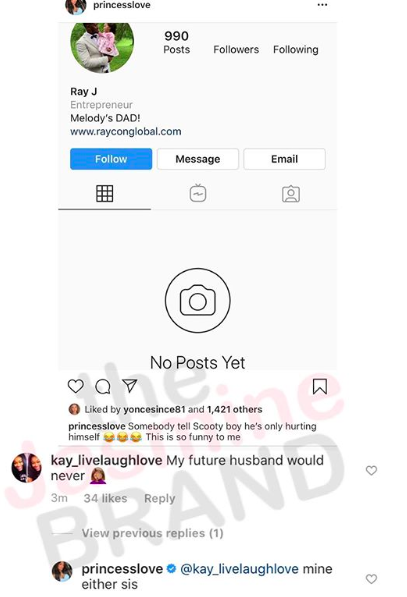 All seemed to be well between them when Ray J shared a video fo Princess Love doing a maternity shoot. But the source added that he was only there because he said he’d watch Melody while his wife did her thing. As for their marriage, Princess Love is said to be still leaning toward divorce.