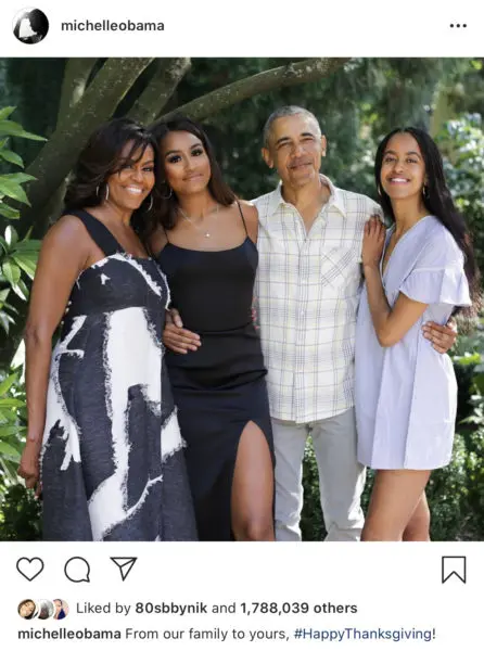 The Obamas’ shared an adorable family moment a day before all the holiday festivities on Instagram on Wednesday (Nov. 26th). In the photo, the 44th President Barack Obama, the former First Lady Michelle Obama, and the couple’s two daughters Sasha and Malia Obama all wished everyone a wonderful Thanksgiving holiday. The former First Lady shared the photo writing,