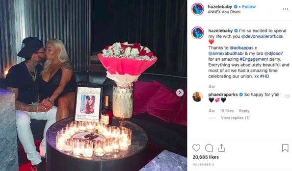 “So this how he did it. Just a romantic night at the house, after running me to the nail shop, the tanning salon (allegedly getting lost to come pick me back up) buying me two dozen roses and waiting for the @astrosbaseball game to end, he dropped to one knee and popped the question! I’m still in shock but yes I’ll change my name @devonwallerofficial . #itsjustus baby! Yes yes yes 4 life… sidebar: I almost fell off the my balcony on the 23rd floor when I saw the [ring]”