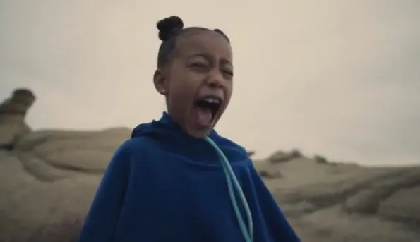 Closing out the music video, North, gets her close-up moment wearing a blue hoodie, screaming “Chick-fil-A” at the top of her lungs.