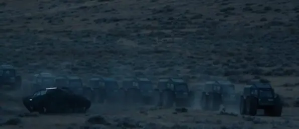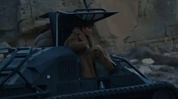 Next, Kanye and the West family take a trip in large-wheeled vehicles where Momanger Kris Jenner makes her appearance wearing a camel-colored fur coat and overalls.