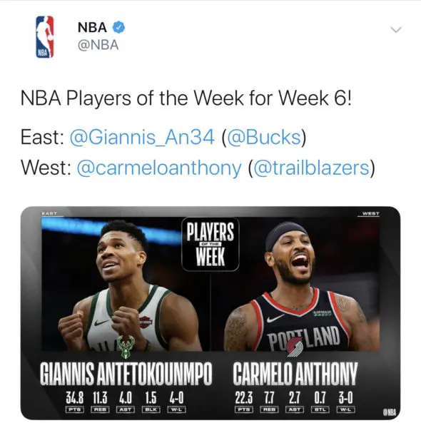 NBA vet Carmelo Anthony has already made his mark in his return to the NBA just over two weeks old. On Monday (Dec. 2nd), the NBA announced Melo’s award, recognizing him for his strong play for The Trail Blazers 3-0 week, beating the Bulls twice as well as the Thunder. Melo led those efforts, averaging 22.3 points, 7.7 rebounds and 2.7 assists.