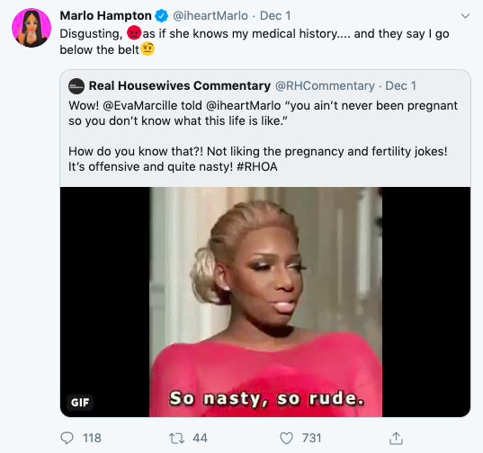Interestingly enough, she also took fertility shots at Marlo Hampton during a dispute and said that Marlo Hampton has never been pregnant. Swipe to see the full moment below.
