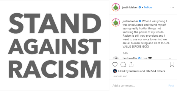 “@justinbieber When I was young I was uneducated and found myself saying really hurtful things not knowing the power of my words. Racism Is still very prevalent and I want to use my voice to remind we are all human being and all of EQUAL VALUE BEFORE GOD!”