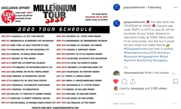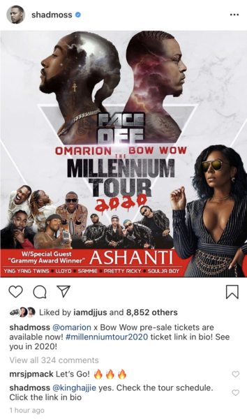 “@shadmoss @omarion x Bow Wow [W/Special Guest “Grammy Award Winner” ASHANTI] pre-sale tickets are available now! #millenniumtour2020 ticket link in bio! See you in 2020!”