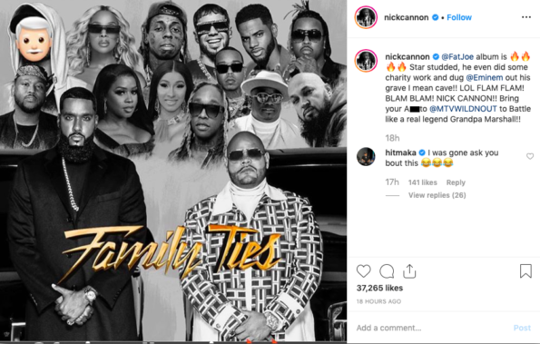 @FatJoe album is ???? Star studded, he even did some charity work and dug @Eminem out his grave I mean cave!! LOL FLAM FLAM! BLAM BLAM! NICK CANNON!! Bring your A** to @MTVWILDNOUT to Battle like a real legend Grandpa Marshall!!