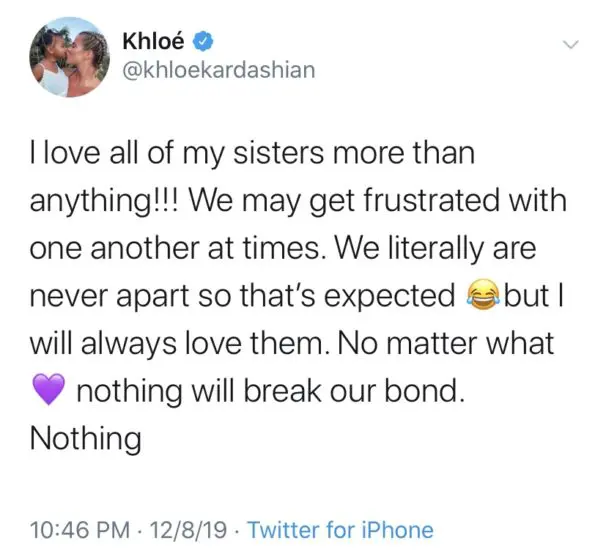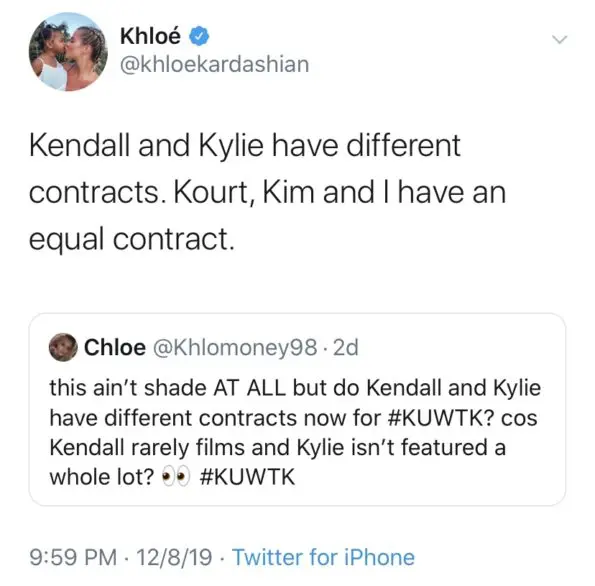 Then, on Sunday’s (12/8/19) episode of “KUWTK”, Kim and Khloe threatened to fire Kourtney if she didn’t open up more about her personal life. A fan even questioned Kourtney’s contractual obligations in comparison to the other sisters. Twitter user @Khlomoney98 asked: