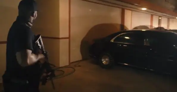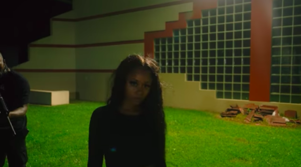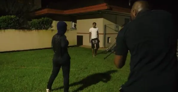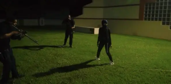 In the video, the rapper’s security team hunts the intruder as she sneaks around the mansion wearing all black. In one scene, the woman takes cover behind a line of bushes to avoid being spotted.