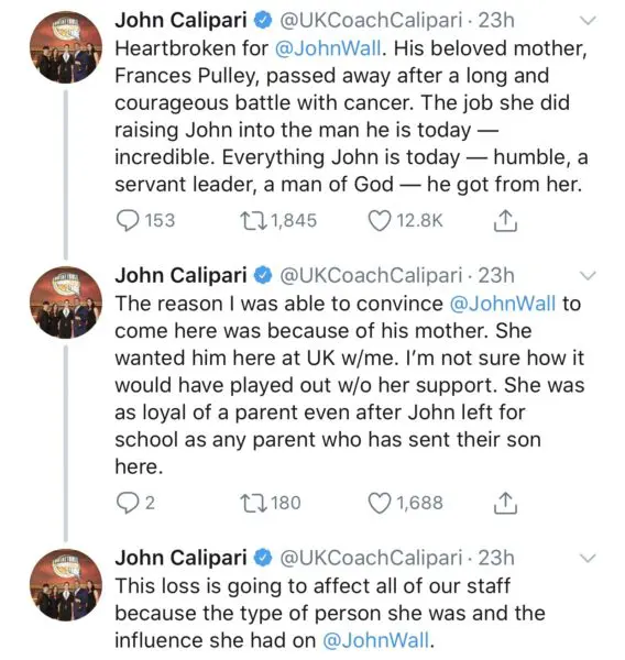 In addition, Wall’s former Kentucky head coach John Calipari, who had an very important role into changing Wall’s life around, took to Twitter to give his condolences to the Wall family.
