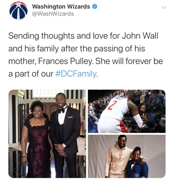 “Sending thoughts and love for John Wall and his family after the passing of his mother, Frances Pulley. She will forever be a part of our #DCFamily.”