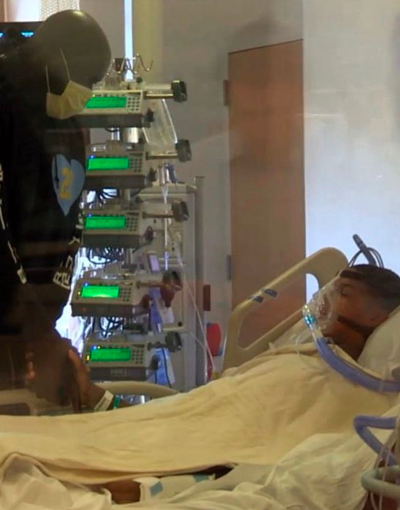 In one video, his dad helps him walk while his mom wipes his face. Another clip shows him receiving treatment while he lays in a hospital bed.