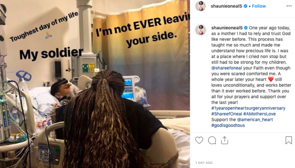 “One year ago today, as a mother I had to rely and trust God like never before. This process has taught me so much and made me understand how precious life is. I was at a place where I cried non stop but still had to be strong for my children. @shareefoneal your Faith even though you were scared comforted me. A whole year later your heart ?? still loves unconditionally, and works better than it ever worked before. Thank you all for your prayers and support over the last year!”